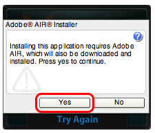 If you do not have the Adobe Air platform installed on your computer, you will be asked if you want it to be installed. Click the 'Yes' button.