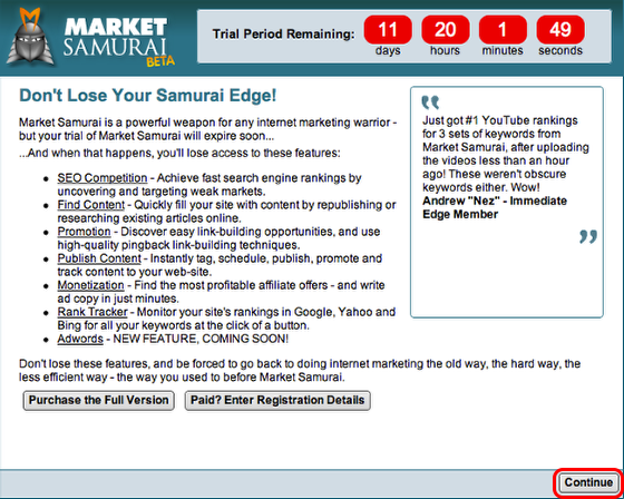 Click the 'Continue' button to begin using your free trial. Your trial will be fully functional for the period indicated by the count down timer.