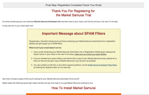 After entering your details you will be taken to a Thank-You page as shown above. Please read the important message about SPAM filters.